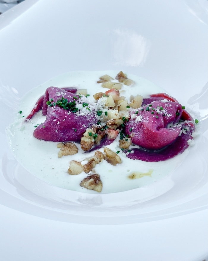 Den hausgemachten Rote-Bete-Tortelloni hat Jasmin einen hauchzarten Teig verpasst und sie mit Walnüssen und süß-säuerlichen Natyra-Apfel-Würfeln, die auch einen Hauch Birnen-Aroma beinhalten, garniert. Die feine Rahmsauce komplettiert den wundervollen Geschmack.