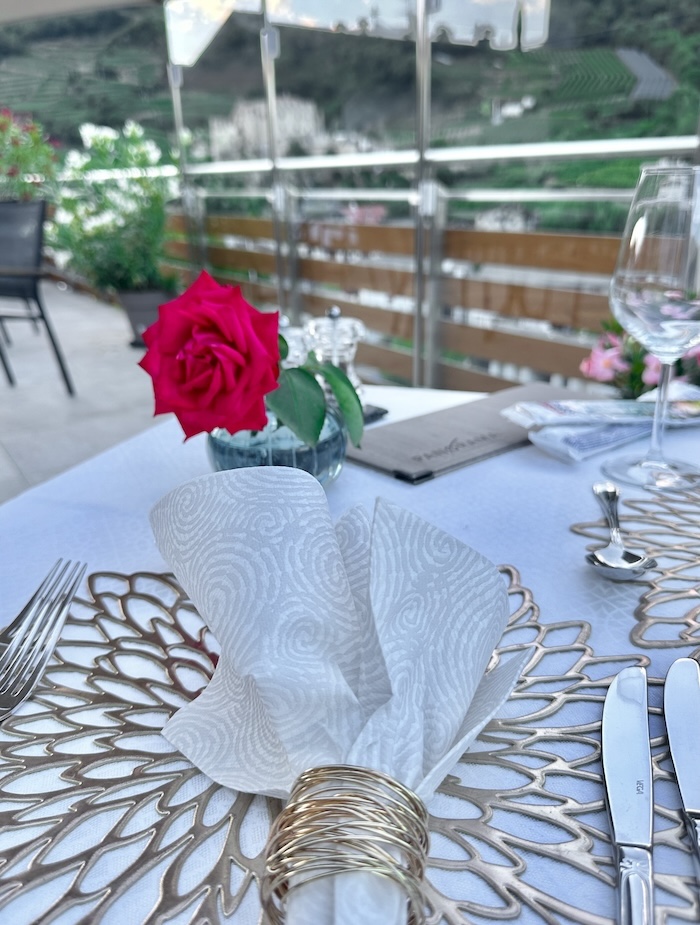 Fein eingedeckt ist die Terrasse und das Menü, das die Halbpensions-Gäste erwartet, klingt verlockend: Hausgemachte Rote-Bete-Tortelloni, holzgeräuchertes Gebirgsforellenfilet, Zitronen-Holunder-Sorbet und ein gefüllter Topfenknödel mit Erdbeeren.