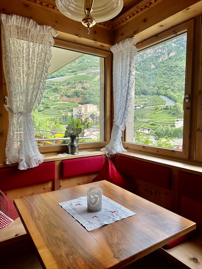 Es ist paradiesisch. Der Tag neigt sich, das Licht wechselt in einen warmen Goldton, der Blick schweift vom Schloss Kastelbell bis weit ins Tal. Die Gäste sinnieren und genießen ihren Aperitif auf der Terrasse.