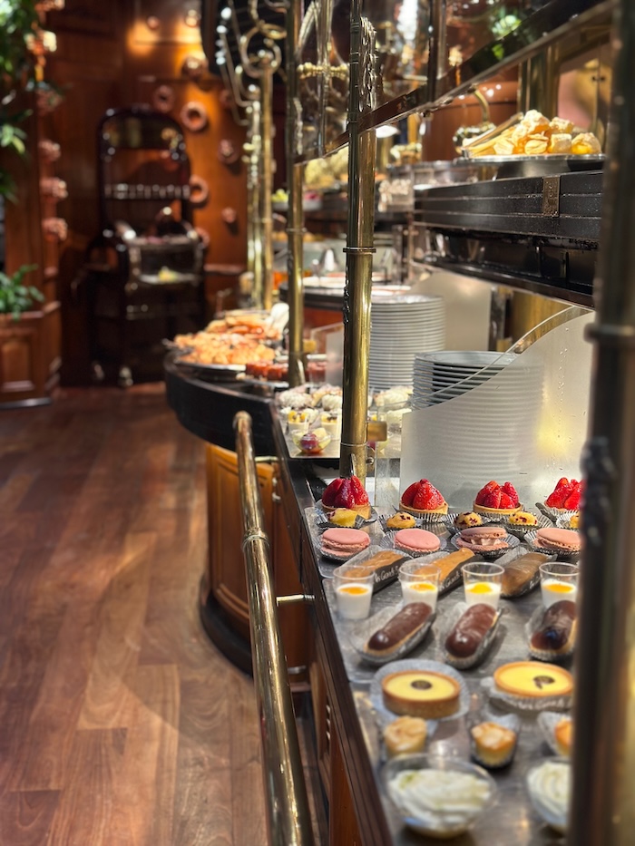 Doch wo anfangen? Die Auswahl ist atemberaubend: Fischsuppe, Meeresfrüchte mit Hummer-Cascade, Austern aus der Lagune von Thau, Taschenkrebse, Schneekrabbenbeinen, Lachsfilet in Aspik oder Jakobsmuscheln à la Nantaise ….Oder doch zuerst ans Foie gras Buffet mit geräucherter Entenleber, Foie-Gras-Terrine mit Trüffel, halbgegarter Entenleber mit Armagnac, Crème Brûlée mit Entenleber und Portwein, dekorativ angerichtet vom Servicepersonal.