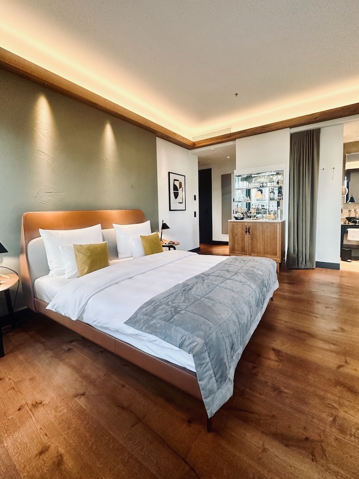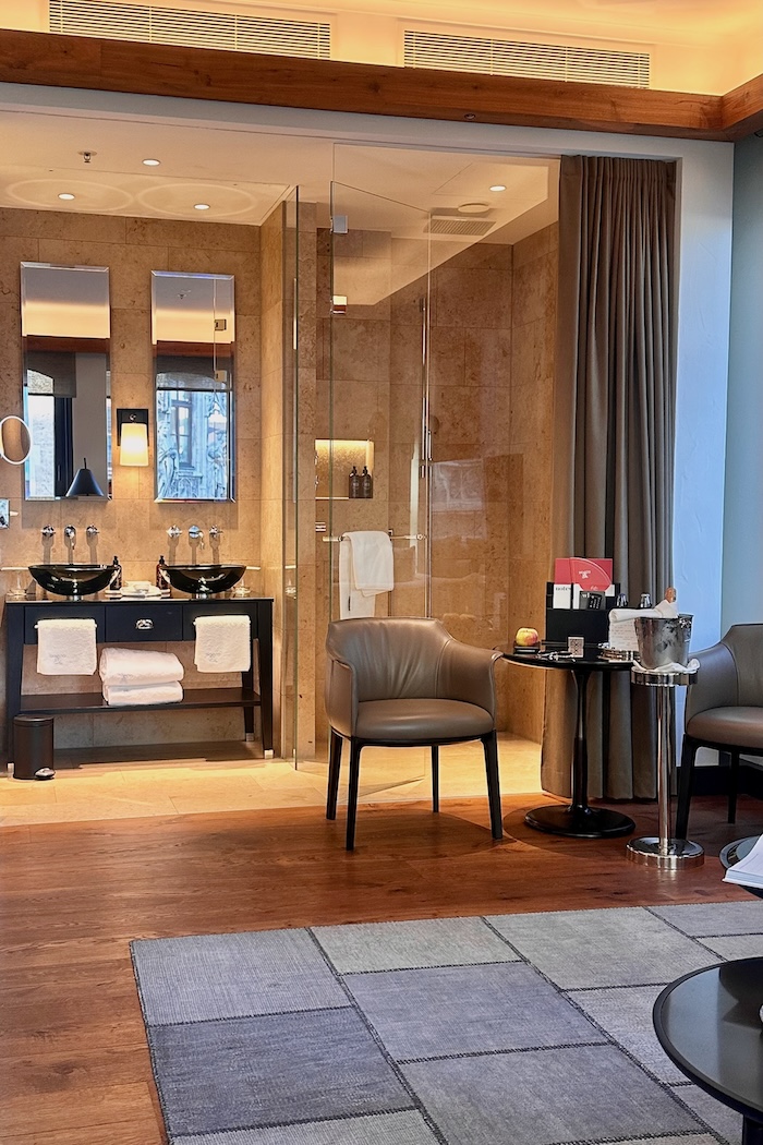 Die Zimmer zeigen eine völlig andere Welt. Italienisches Design, bevorzugt Poltrona Frau, GamFratesi oder Roberto Lazzeroni, Eichenparkett, Natursteinduschen in einem Glaskubus, warmes Licht. Stilsicher, minimalsitisch und mit besonderen Features ausgestattet, darunter die In-Room Champagner-, Wein & Spirituosenbar, die ihrem Namen Rechnung trägt.