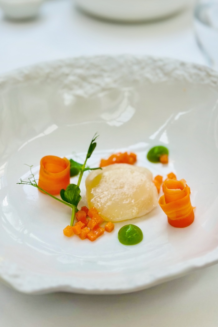 Der erste Gang: Jakobsmuschel, raffiniert kombiniert mit Sanddorn und Karotte, eine mild-süße Kombination. Dazu serviert uns Sommelière Sabrina einen Raventós i Blanc Blanc de Blanc aus Katalonien, ein Schaumwein voller frische und Komplexität. 5% Malvasio Traube, Rest Macabeo, Xarel-lo und Parellada. Wunderbar, die foodhunterin nimmt ein zweites Glas.