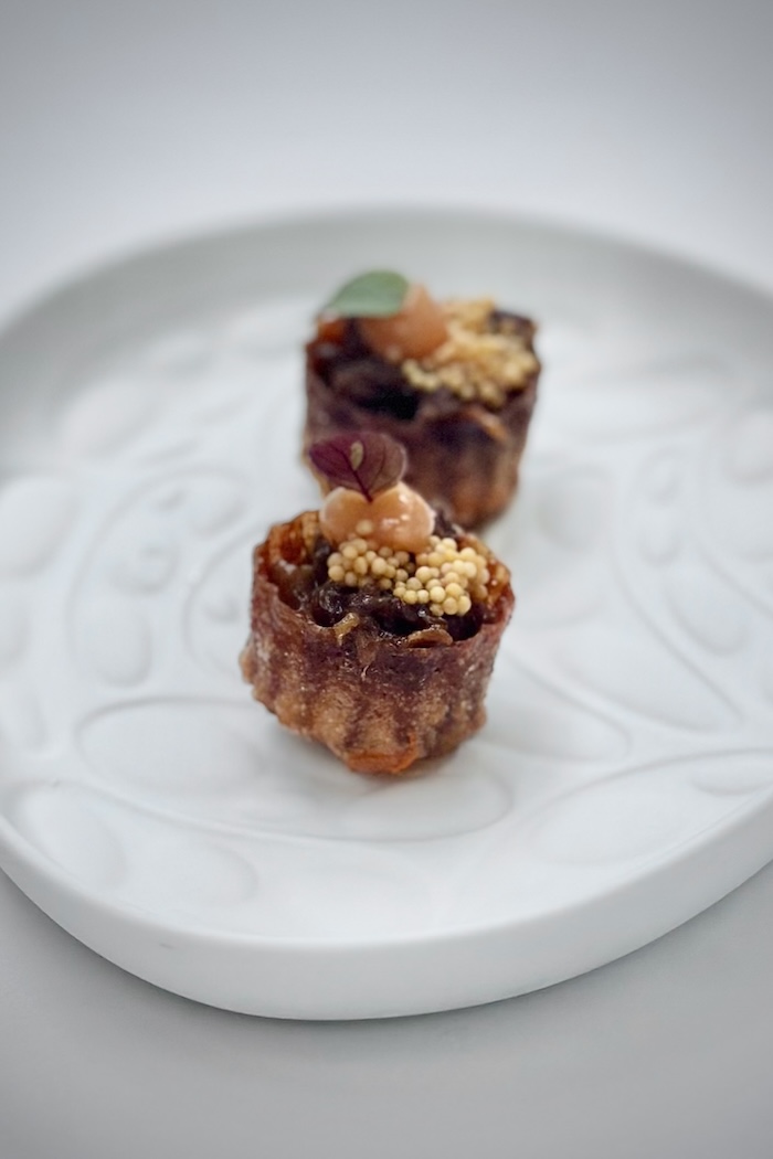 Dieser Aufwand zeigt sich bereits mit den beiden Snacks vorweg: Warmes Ochsenschwanz-Törtchen mit Zitrusfrucht-Gel und knusprige Cannelloni, gefüllt mit Mollera (Fisch) und Zitronen-Gel. Winzige Kunstwerke und jedes für sich Ausdruck des charakteristischen Geschmacks der Insel.