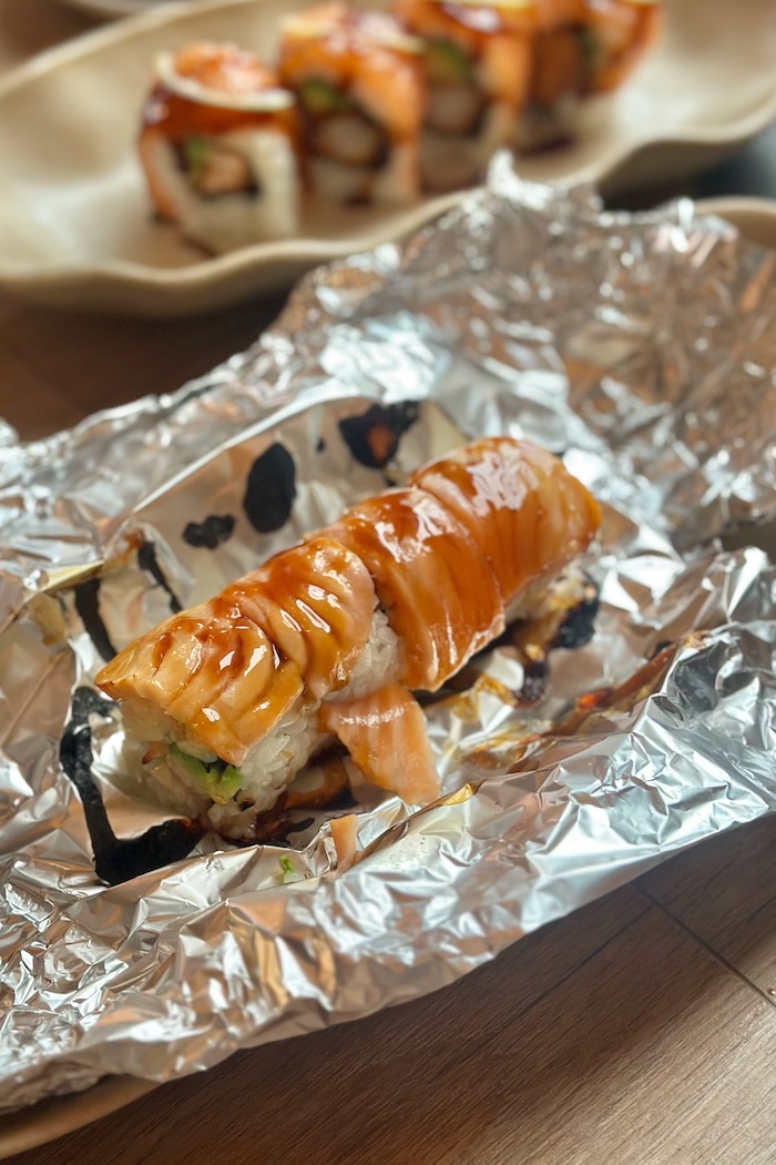 Dann ein wahres  ein Feuerwerk der Aromen: Medio Nagami on Fire, flambierte Makis mit Räucheraal umhüllt von Lachs und Avocado. Sensationell! Dazu Medio Lima Maki, knusprige Garnele mariniert in Limetten-Soja sowie Sashimi vom Lachs mit Zwiebel, Knoblauch und Ingwer in Ponzu-Sesam-Essig.