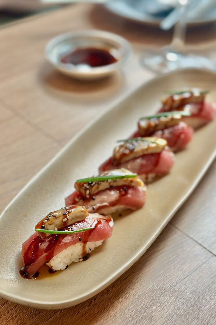Es folgt Nigiri von rotem Thunfisch mit Foie gras. Eine gewagte Kombination und müsste unserer Ansicht nach auch nicht sein – der exzellente Thunfisch bräuchte kein Topping.