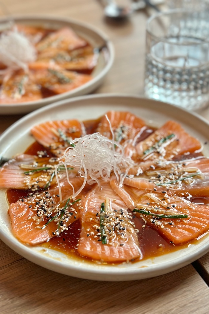 Es folgt Tataki vom Lachs mit Ponzu Sauce und geröstetem Sesam. Ehrlich gesagt hätten wir gerne die restliche Sauce vom Teller geschlürft ….