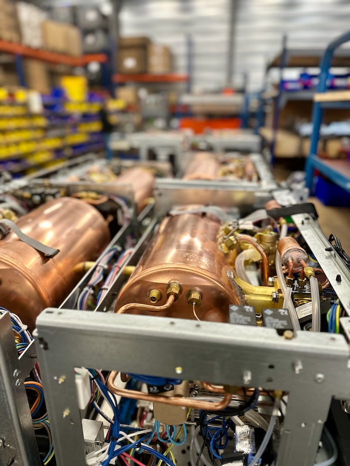 Gefertigt wird in der Halle neben dem Showroom. Es blitzt und funkelt: Kupfer, Chrom, Messing – das Innenleben einer Reneka gleicht einem Schweizer Uhrwerk und genauso funktionieren die Luxusmaschinen auch. Qualität fast für die Ewigkeit.