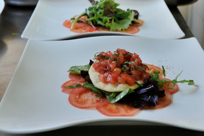Tomaten schälen, von Kernen befreien, in kleine Würfel schneiden. Mit Fleur de Sel, klein geschnittenem Basilikum und Olivenöl mischen, durchziehen lassen. Auf die Tarte legen (je nach Wunsch ein wenig angemachten Salat darunter) und kurz in den Ofen, damit beides warm wird.